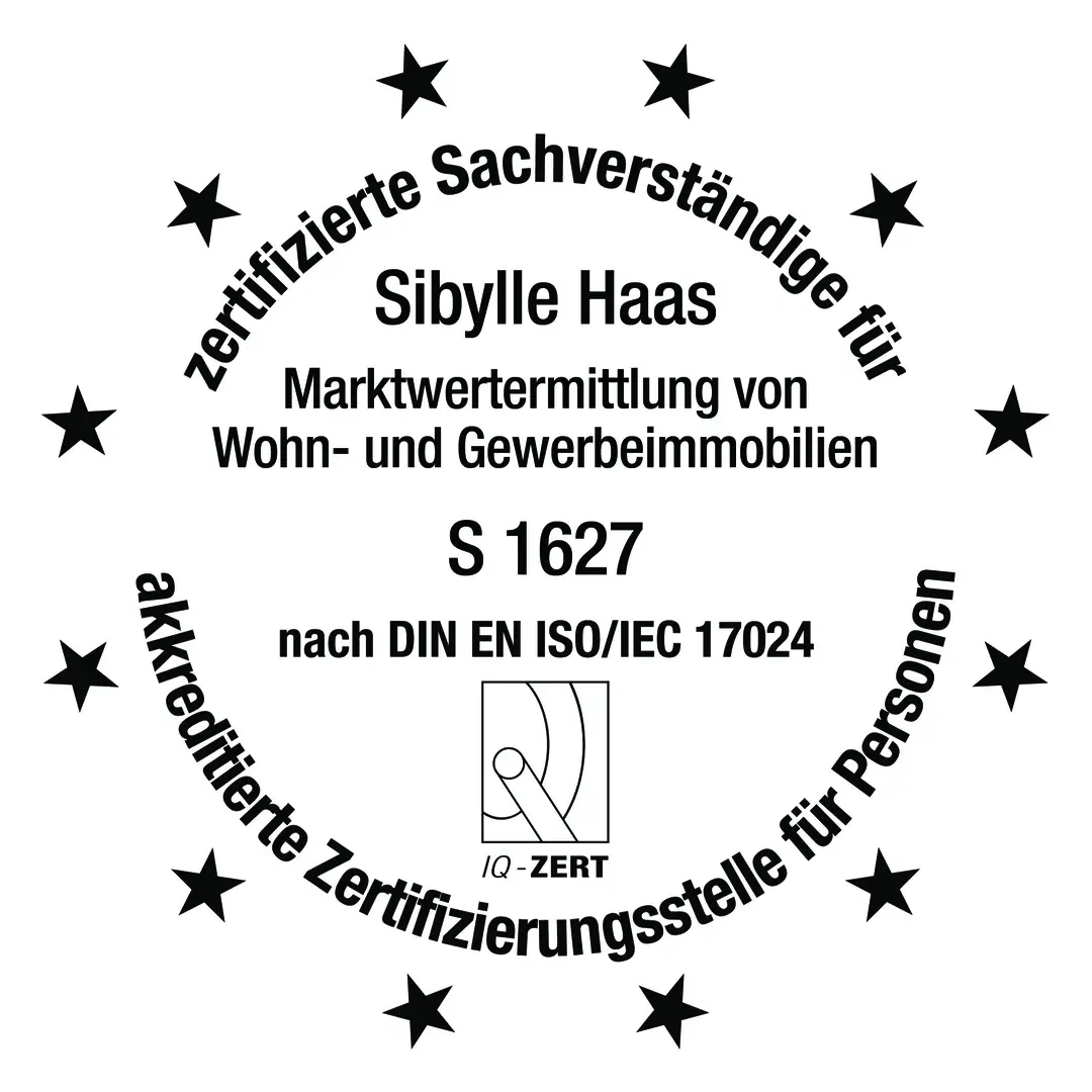 Sibylle Haas ist zertifizierte Sachverständige für die Marktwertermittlung von Wohn- und Gewerbeimmobilien nach gem. IQ-Zert gem. DIN EN ISO/IEC 17024 sowie DEKRA zertifizierte Sachverständige für die Immobilienbewertung D3